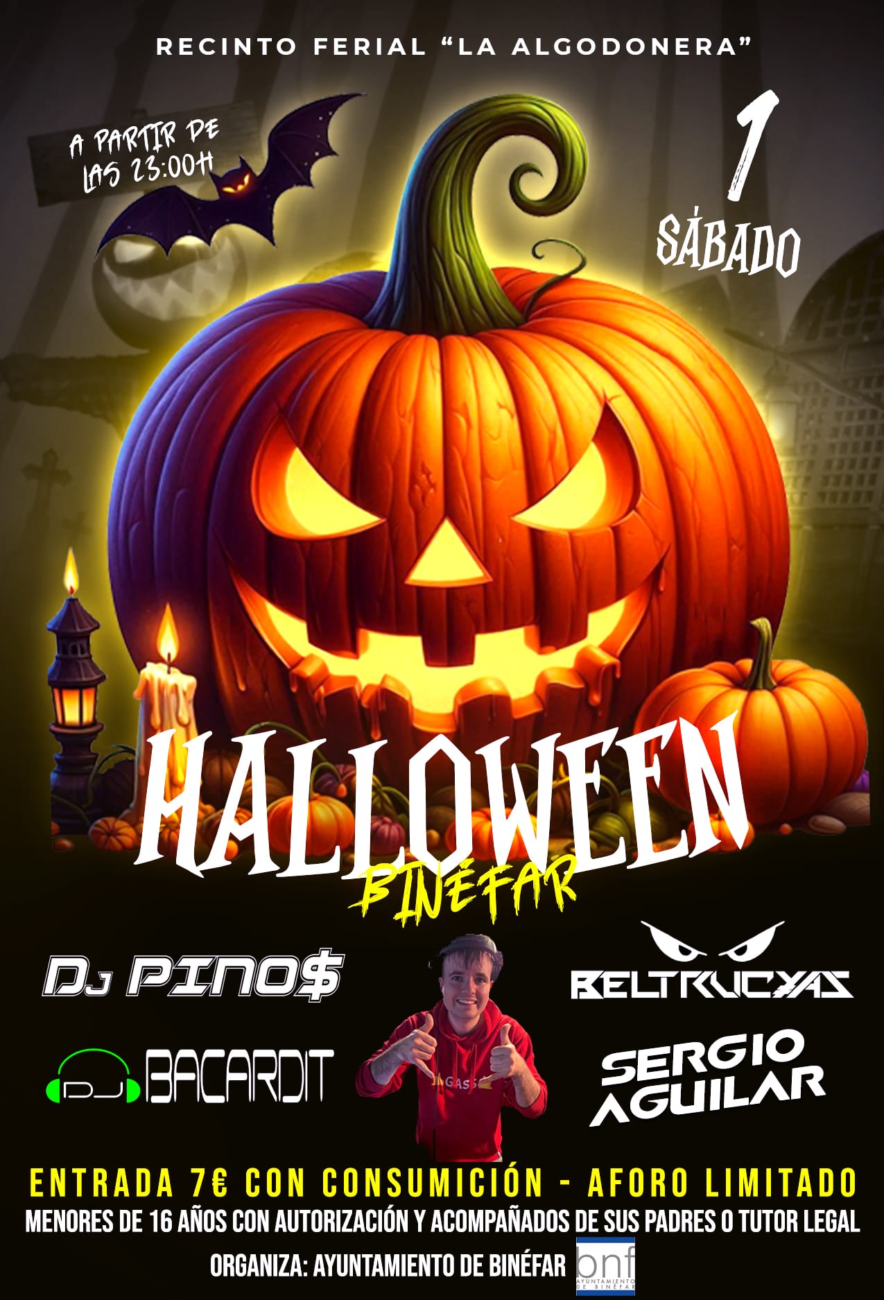 La programación para estos días terroríficos organizada por la Concejalía de Juventud incluye además una verbena ‘Halloween party’ en el recinto ferial de La Algodonera el sábado 1 a partir de las 23.00 h. en la que sonará la música de los dj’s Pino$, Beltrucyas, Bacardit y Sergio Aguilar. La entrada es de 7 euros e incluye consumición. El aforo es limitado y los menores de 16 años deberán de acudir con autorización y acompañados de sus padres o tutor legal.